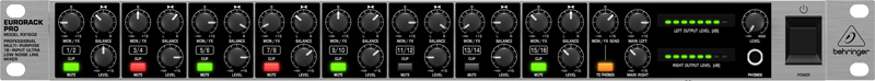 EURORACK PRO RX1602 имеет 16 линейных балансных входов со значительными резервами динамики с возможностью использования каждой секции в режиме стерео или моно. Для каждого канала предусмотрен переключатель рабочего уровня +4 dBu / -10 dBV. Управление каналами вынесено на переднюю панель устройства. В каждой из восьми канальных секций оставлен лишь минимум настроек, отвечающих за базовые параметры микширования: регулятор уровня, поворотный потенциометр, определяющий баланс, кнопка mute, заглушающая сигнал, индикатор клиппирования. Ещё один контроллер определяет посыл канального сигнала на выходы Mon или FX. Главная секция организована похожим образом. В неё вынесен регулятор посыла Mon/FX, переключатель посыла сигнала на гнездо для наушников, и раздельные контроллеры уровня для левого и правого каналов главного микса.
