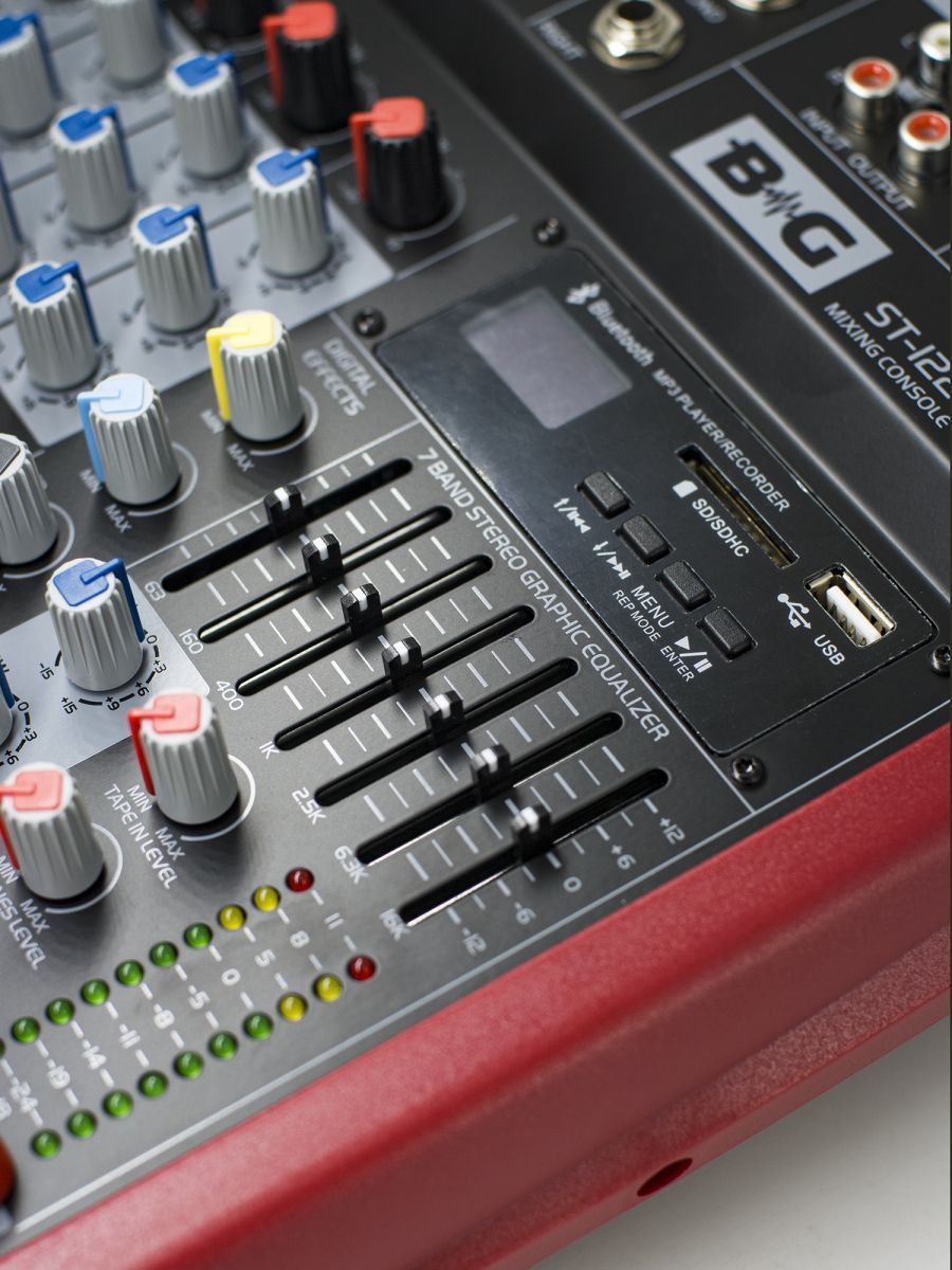 Микшерный пульт обладает компактным дизайном и имеет две прочные боковые ручки. Панель управления может наклоняться на 10 градусов в целях обеспечения наилучшего обзора, что является большим преимуществом. BG ST-122 обладает 3-полосным эквалайзером и процессором DSP-эффектов. Консоль оснащена слотом для карты SD и портом USB. Главной особенностью модели является наличие встроенного MP3-плеера, который может записывать аудиосигнал, исходящий с канала main, и сохранять его в текущий блок памяти в формате WAV. Микшерный пульт BG ST-122 прекрасно подходит для использования дома, на концертах и в студиях.
