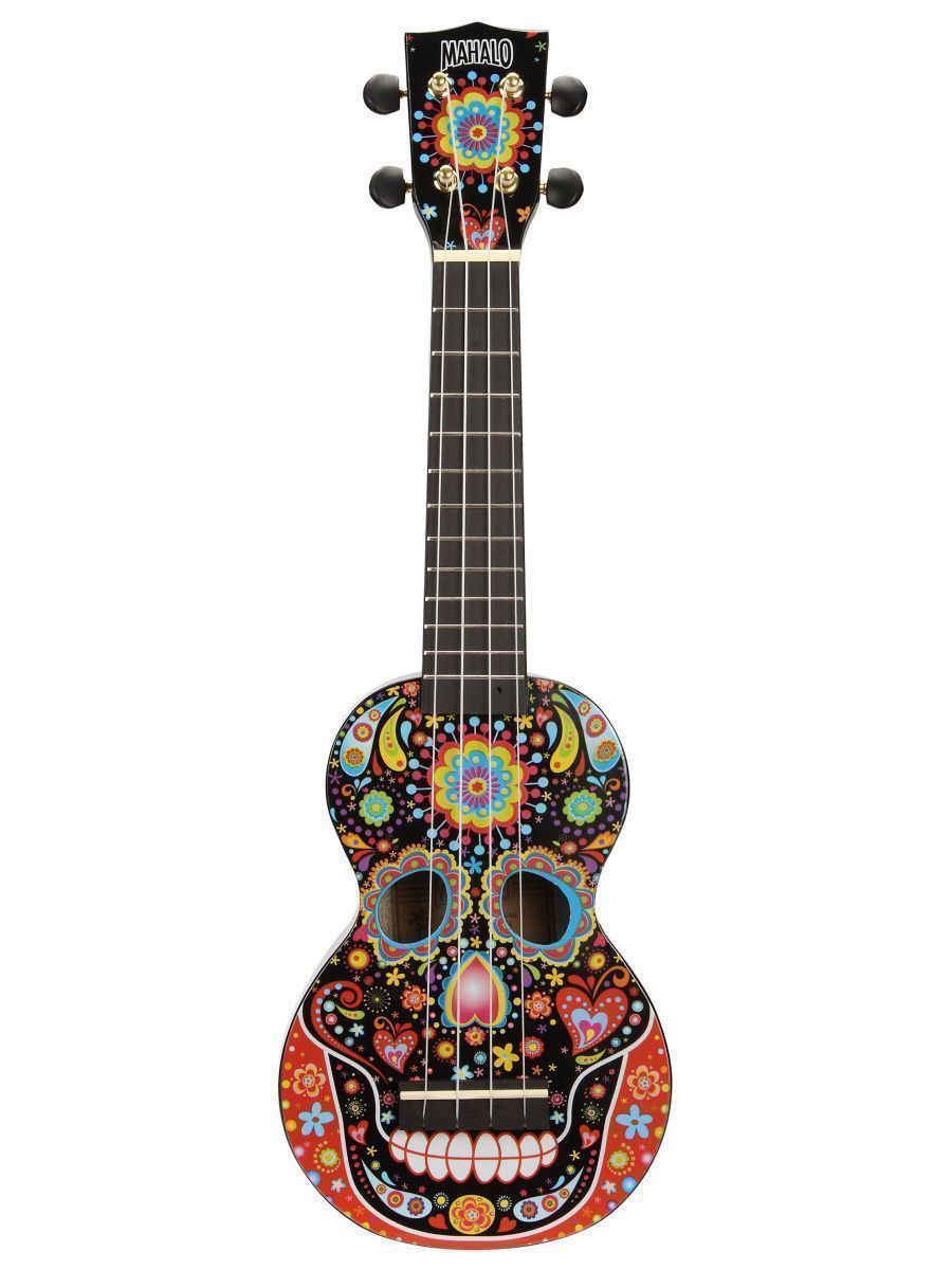 Mahalo MA1SKBK Укулеле сопрано с чехлом, корпус - липа, гриф - габон, накладка на гриф махагони, струны Aquila Super Nylgut, цвет - Black, лакированная, рисунок - череп, серия Art Soprano